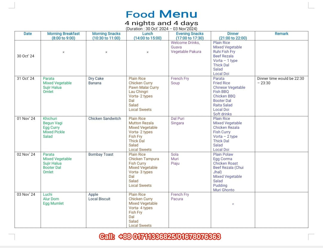 ২. সকল প্রকার খাবার। ( ব্রেকফাস্ট + লাঞ্চ + ডিনার + প্রতিদিন ২ টা স্নাকস্ । চা / কফি আনলিমিটেড টাইম ।