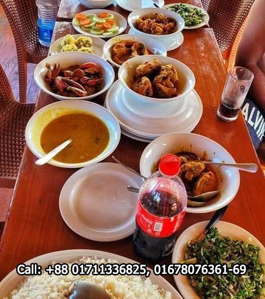 দুপুরঃ সাদা ভাত+ মুরগি+ চাপিলা মাছ /কাচকি মাছ ফ্রাই+ বড়ো মাছ+ মিক্সড ভেজিটেবল+ ডাল+ ডেজার্ট+ সালাদ + কোল্ড ড্রিংকস+ চা/কফি।